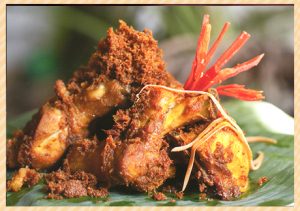 | 1.5 kg chicken thighs, cut into pieces | | 1 kg palm oil for deep frying | | 10 stalks Iemongrass | | 2 cm fresh ginger root | | 5 cm galangal | | 3 cm fresh turmeric root | | 5 cloves garlic | | 1 tbsp fennel seeds | | 1 tbsp cumin seeds | | 1 tbsp coriander seeds | | 1/2 tbsp sea salt | | 1/2 tbsp white pepper | | 1/2 tbsp brown sugar | | 2 tbsp com flour |
